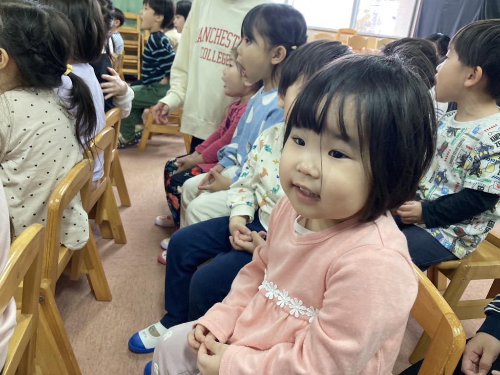 今日は、4月に入園した年少さんも一緒に礼拝をしますよ!並んでホールに登場!!